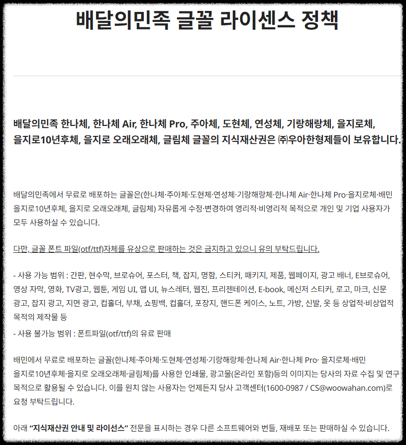 배달의 민족을 운영하는 우아한형제들에서 무료로 글꼴을 사용할 수 있도록 하고 있다.